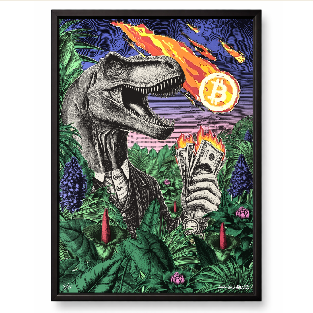 A burning Bitcoin meteor cuts through the sky, while the bankstersaur counts what he still believes holds value. His watch reads five minutes to midnight.