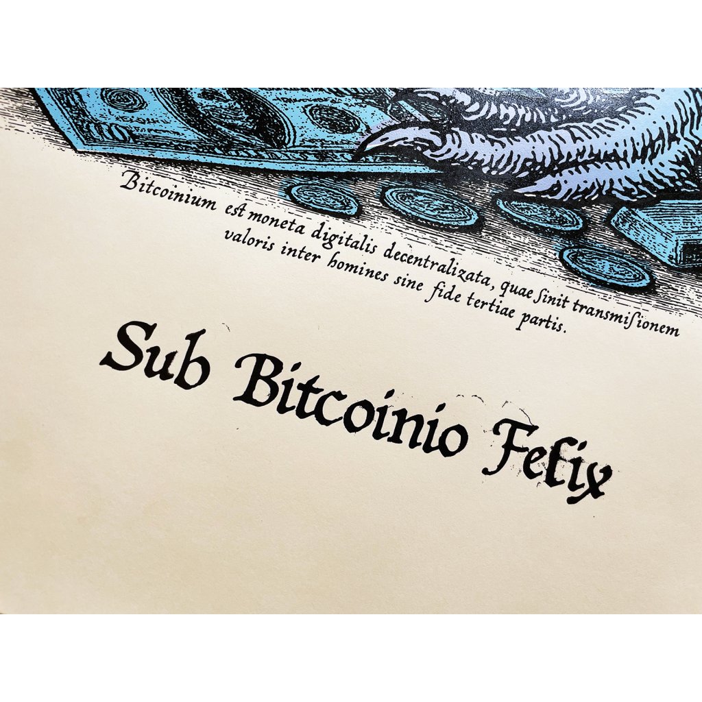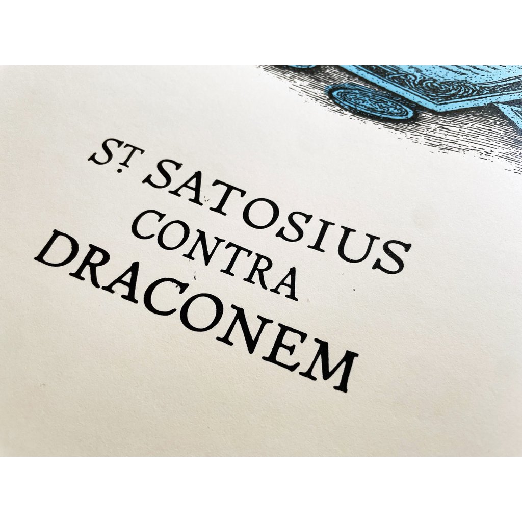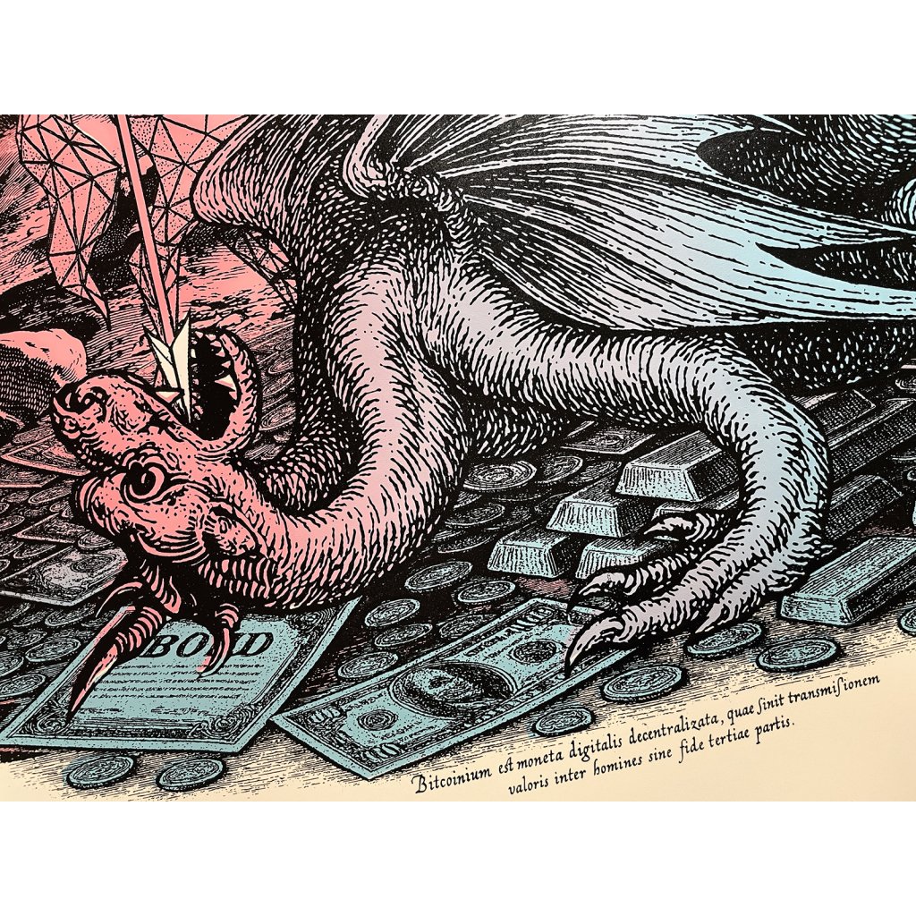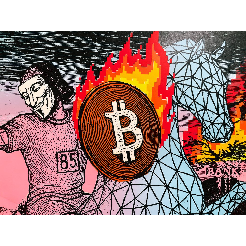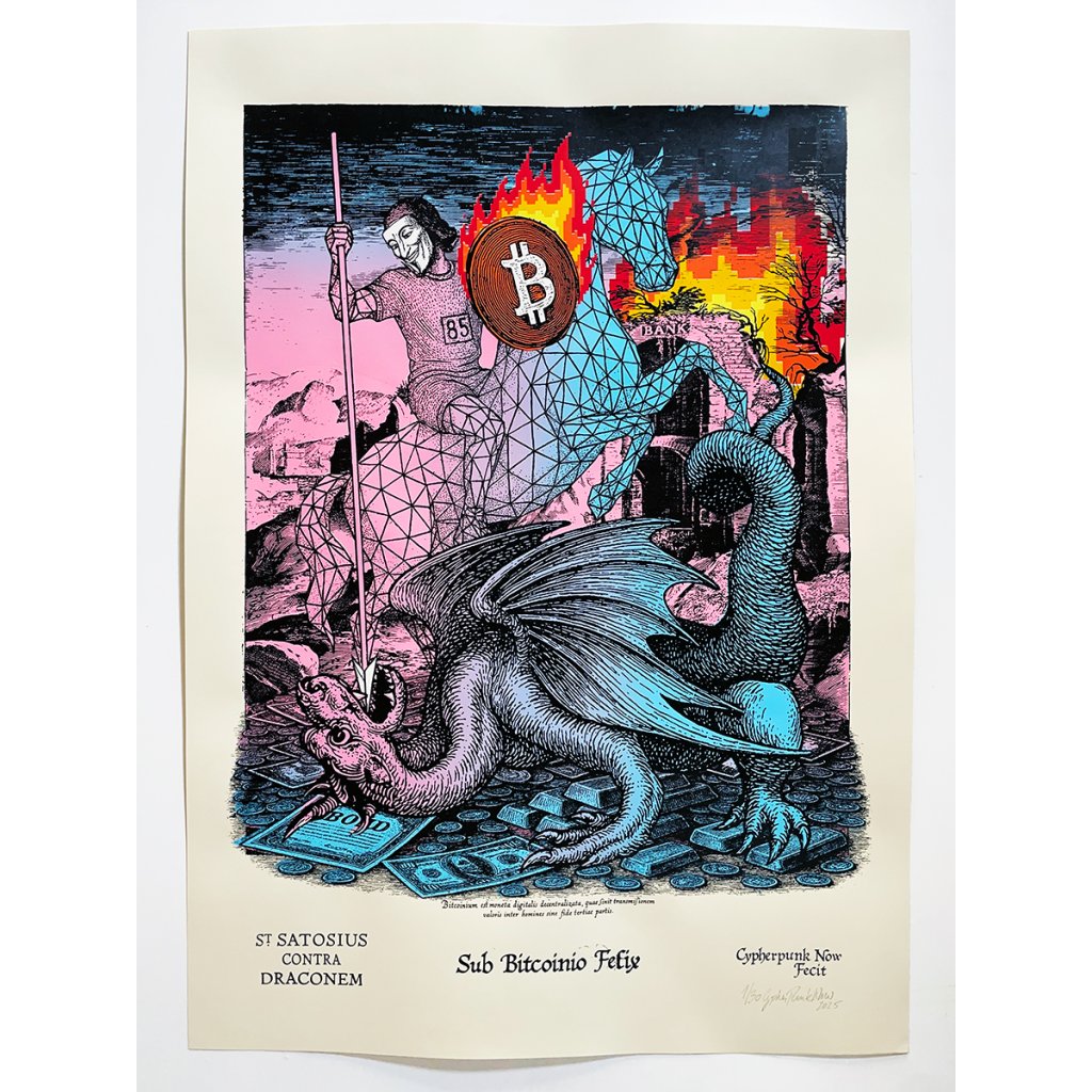 “St. Satosius Contra Draconem” merges medieval iconography with the disruptive narrative of Bitcoin. Echoing Saint George slaying the dragon, the holy warrior becomes St. Satosius – a symbolic Satoshi Nakamoto, riding a wireframe horse from the digital realm.
