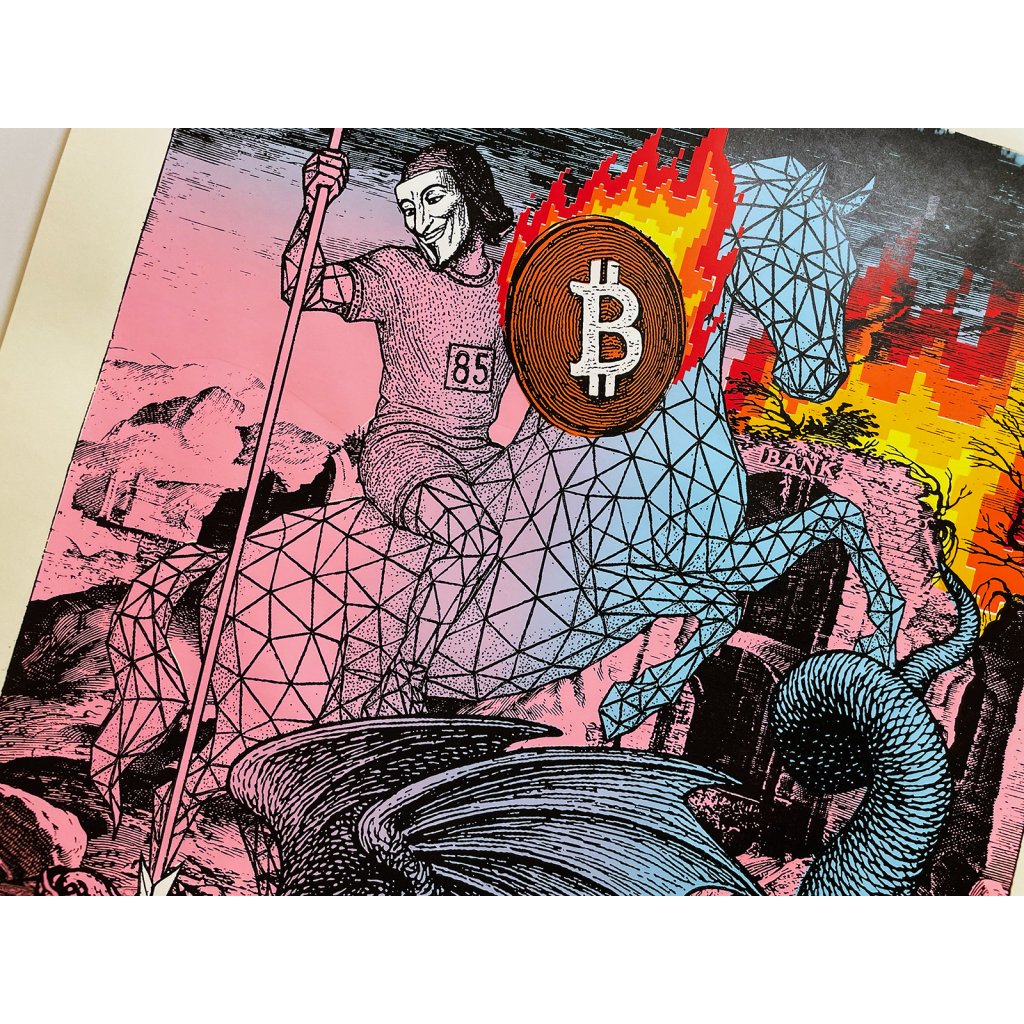 The dragon embodies the old financial order, surrounded by money and coins, burning as a bank collapses in the background. The flaming Bitcoin shield stands against it – both protection and transformation. The rider’s mask evokes the cypherpunk spirit: resistance, defiance, and belief in freedom through cryptography.